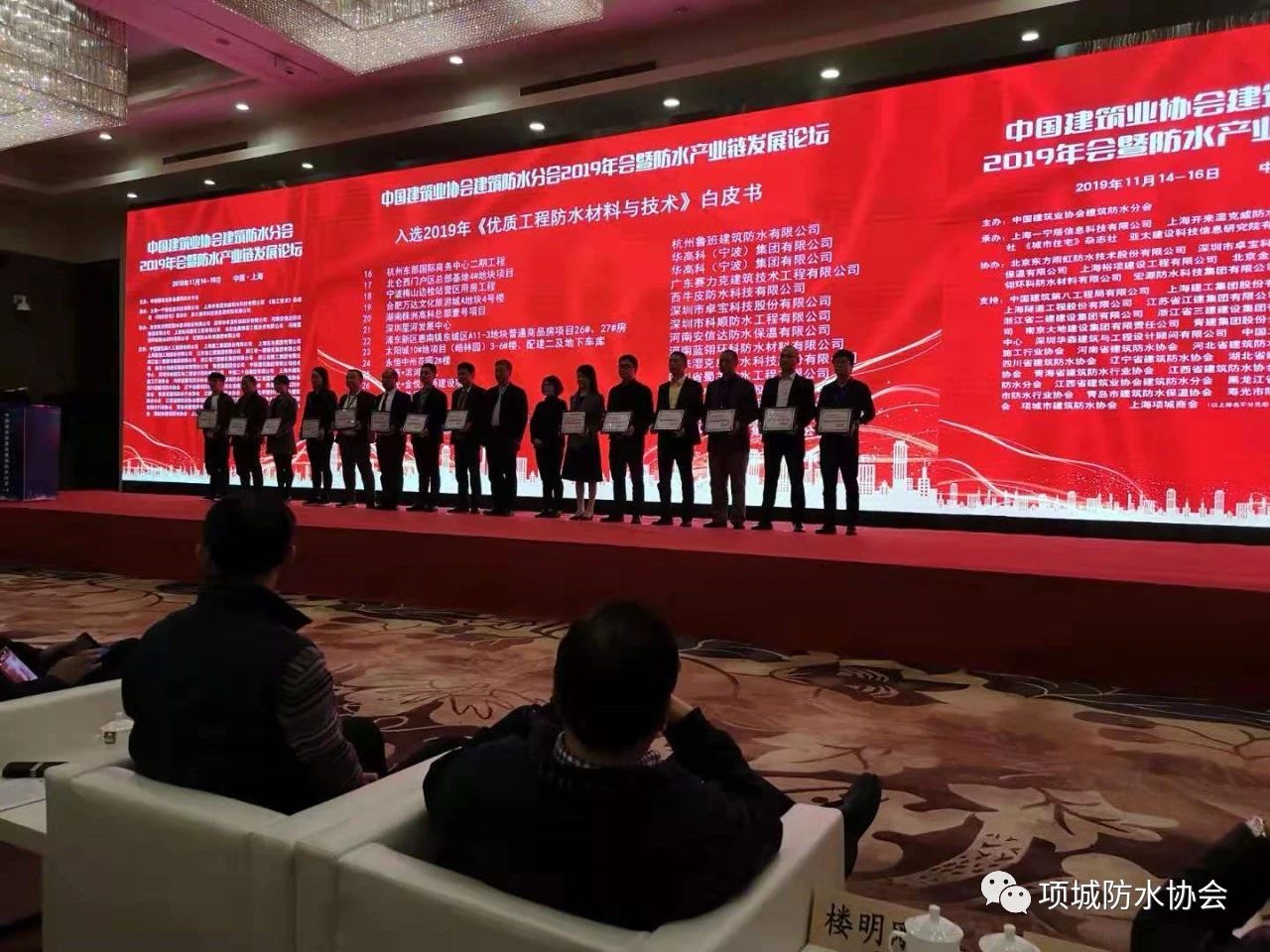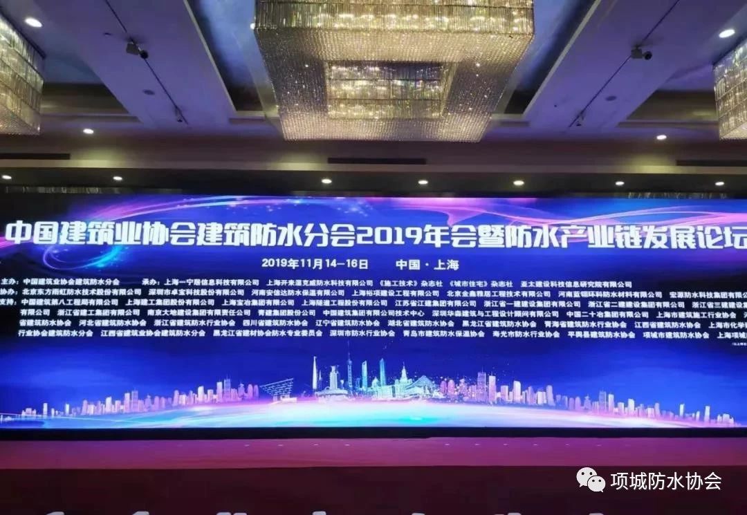 11月15日,中國(guó)建筑業(yè)協(xié)會(huì)建筑防水分會(huì)2019年會(huì)暨防水產(chǎn)業(yè)鏈發(fā)展論壇在上海召開(kāi)。中國(guó)建筑業(yè)協(xié)會(huì)會(huì)長(zhǎng)、原住建部總工程師、辦公廳主任王鐵宏,中國(guó)工程院院士肖緒文,中國(guó)建筑業(yè)協(xié)會(huì)副秘書(shū)長(zhǎng)景萬(wàn),中國(guó)建筑業(yè)協(xié)會(huì)建筑防水分會(huì)會(huì)長(zhǎng)熊衍仁、專家委員會(huì)名譽(yù)主任葉琳昌、專家委員會(huì)主任曲慧、常務(wù)副會(huì)長(zhǎng)兼秘書(shū)長(zhǎng)張可文等領(lǐng)導(dǎo)、專家及全國(guó)各地防水同行、地方防水社團(tuán)組織領(lǐng)導(dǎo)、國(guó)內(nèi)外專家學(xué)者共近300人出席會(huì)議。項(xiàng)城市政協(xié)副主席、防水協(xié)會(huì)會(huì)長(zhǎng)王養(yǎng)嶺率領(lǐng)項(xiàng)城防水代表團(tuán)參加此次大會(huì)。