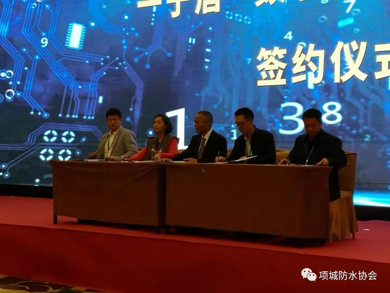 王養(yǎng)嶺會(huì)長(zhǎng)(右二)在防水產(chǎn)業(yè)鏈平臺(tái)簽約儀式上簽字