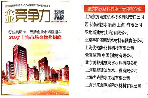 開來濕克威榮獲 “2017上海市建筑防水材料行業十大領軍企業金楹獎”